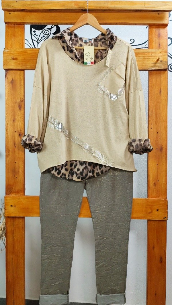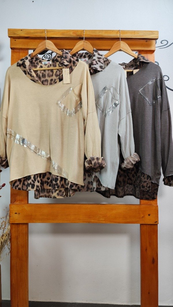 Camisola Animal Print con sweater de lanilla superpuesto con detalles de foil y costuras plateadas