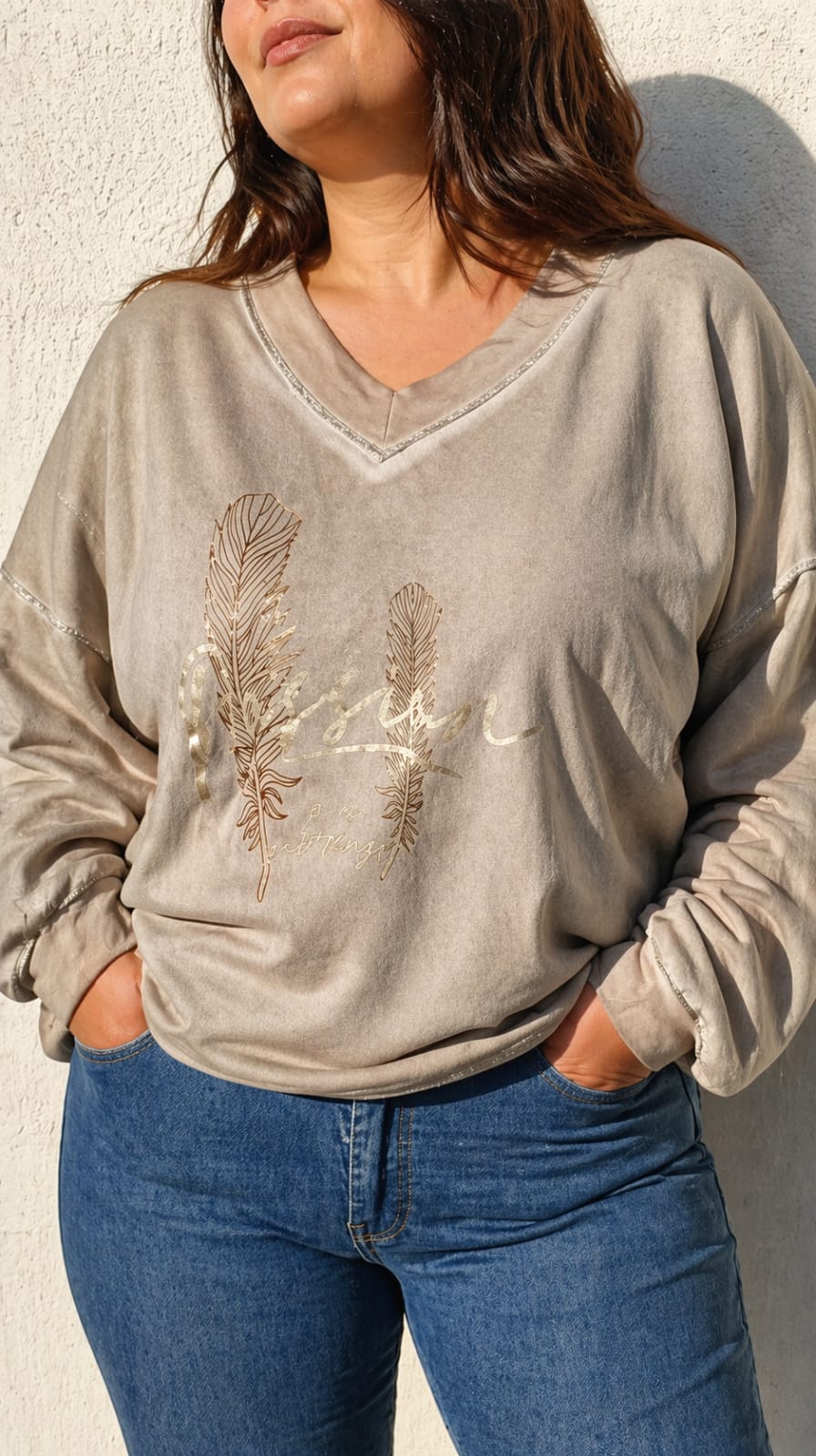 Estilo relajado con un toque sofisticado. Este buzo de inspiraciĂłn italiana destaca por su diseño de plumas en acabado brillante que eleva cualquier look casual. Su calce oversize y escote en V lo hacen cĂłmodo, moderno y fácil de llevar todos los dĂas.