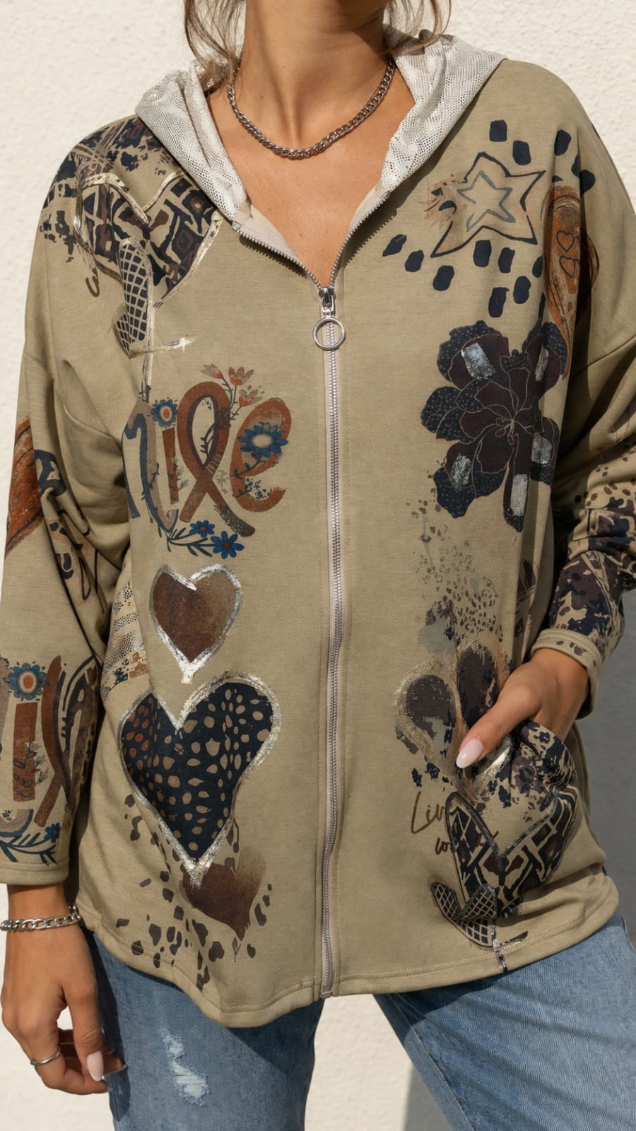 Campera Sorrento con un diseño artístico y súper original, combina estampas únicas con una vibra relajada y moderna que transforma cualquier look en algo especial.