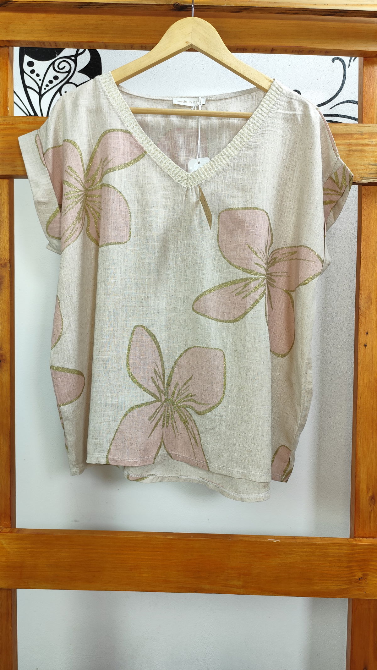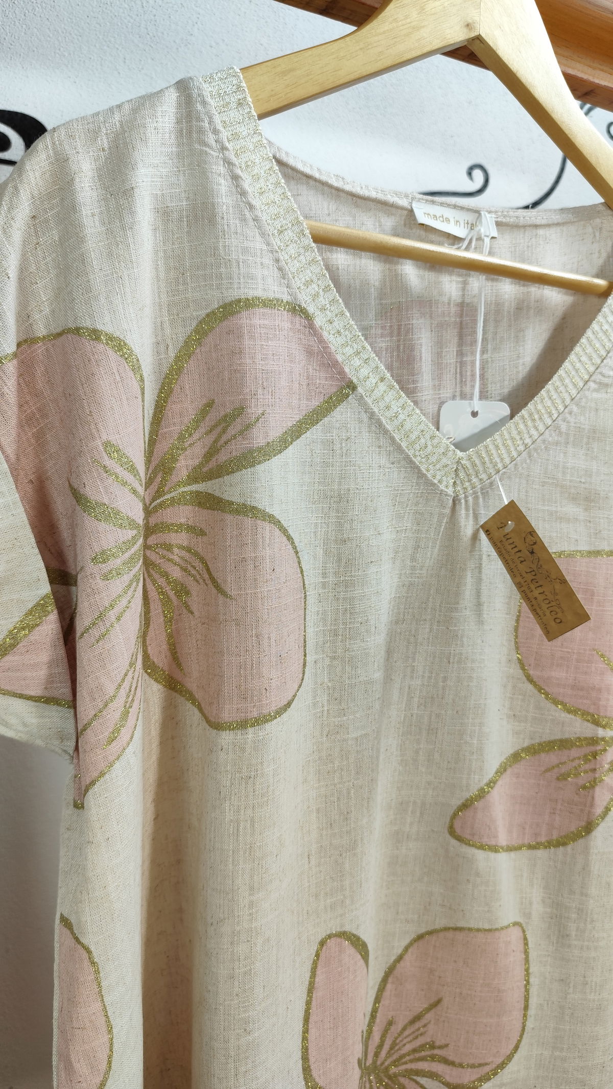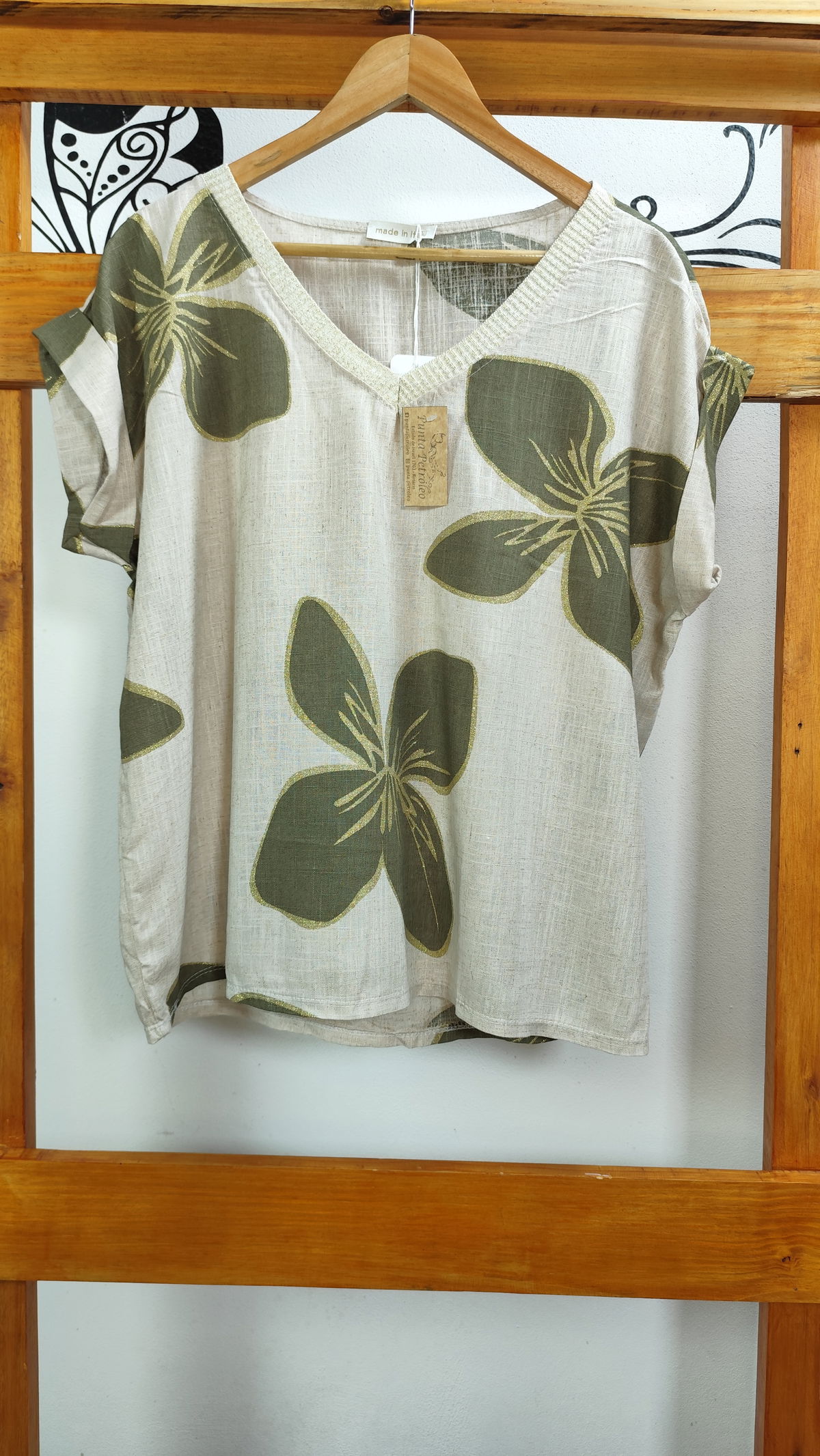 Remera Italiana 100% linoescote V, estampa de flores con detalles dorados