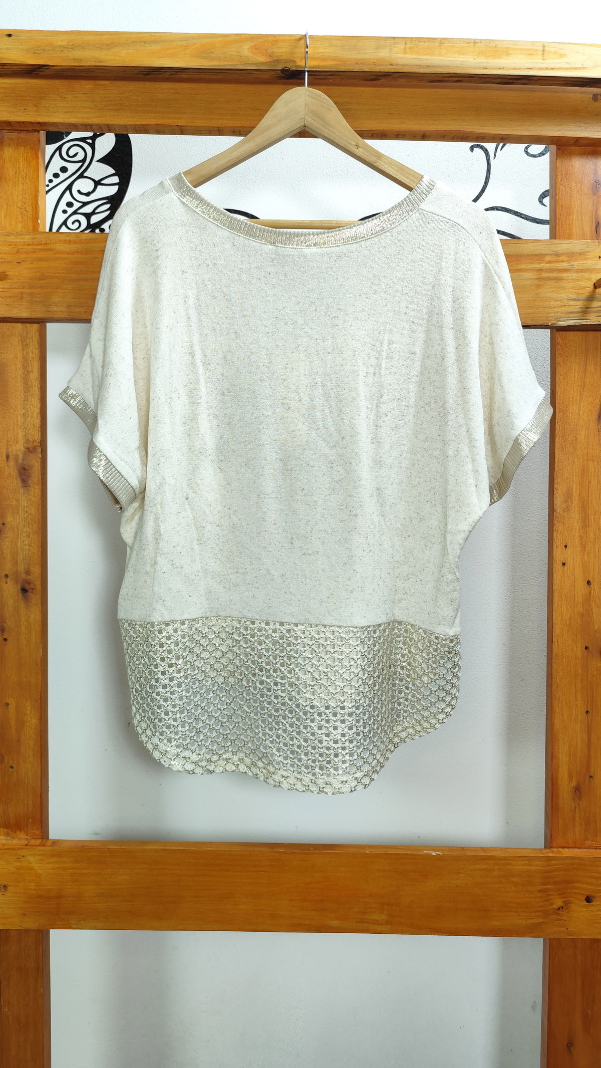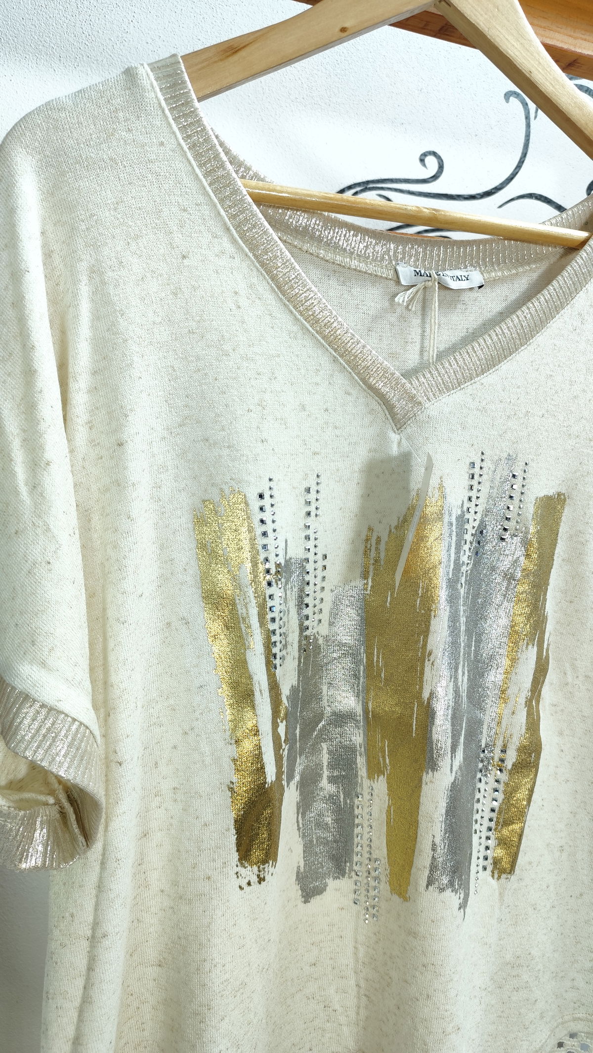 Remera Italiana de hilo escote V con brillo. Estampa en foil con tachas y Strass