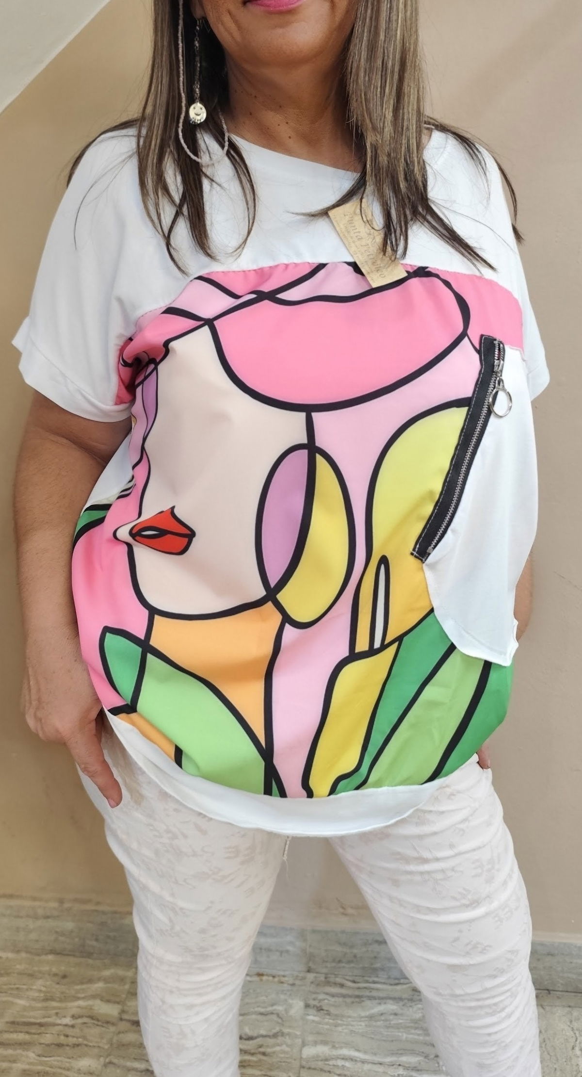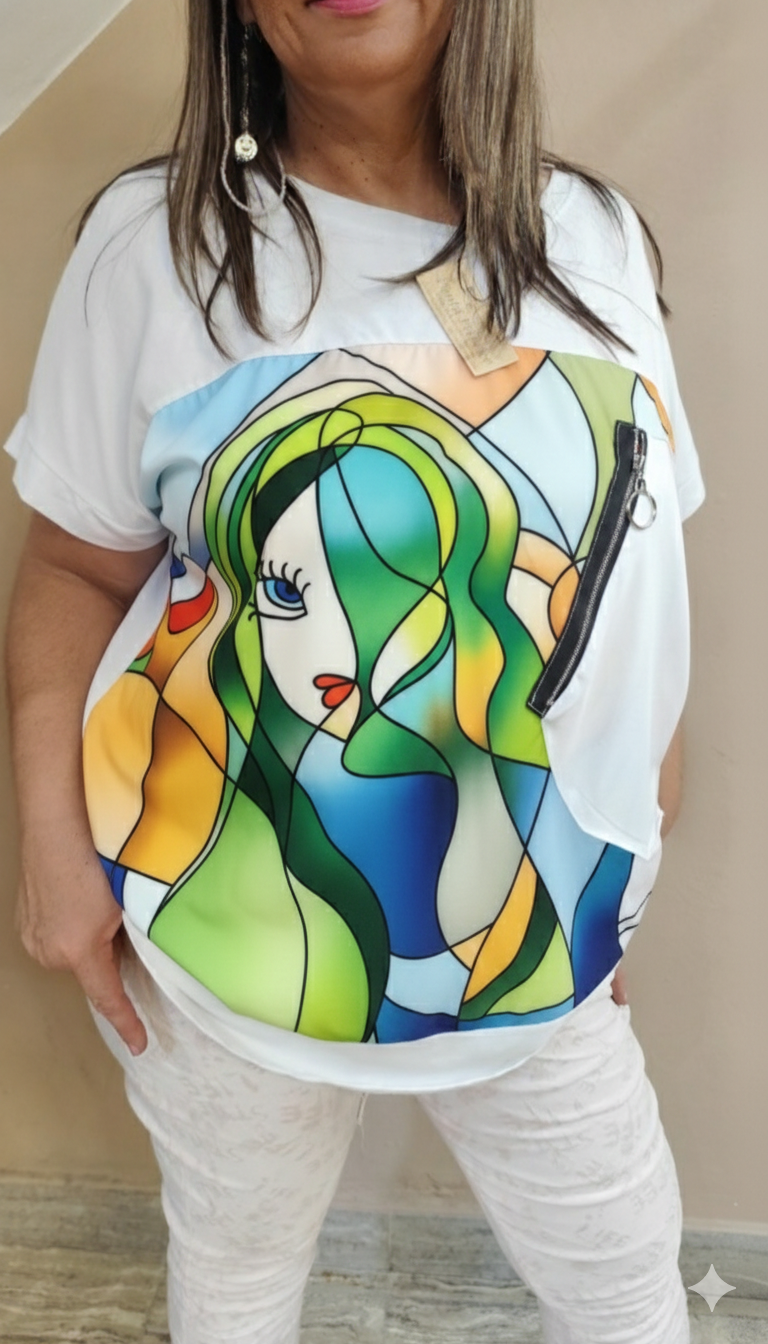 Remera italiana de diseño artístico con estampa frontal abstracta en tonos vibrantes. Frente confeccionado en tela satinada tipo seda fría, liviana y de excelente caída, combinada con cuerpo en algodón suave. Presenta mangas murciélago (tipo japonesa) que aportan comodidad y calce relajado. Detalle de bolsillo con cierre metálico que suma un toque moderno y distintivo. Ideal para looks casuales con personalidad.