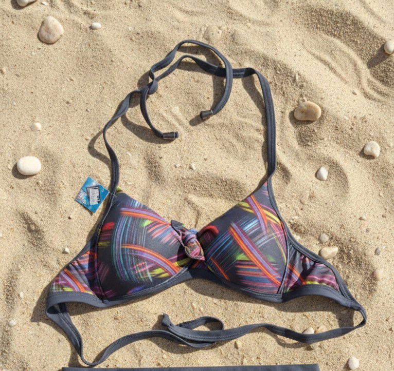 Corpiño Bikini de lycra premium con taza. Presenta un estampado geométrico de trazos multicolores sobre un fondo oscuro profundo, logrando un equilibrio entre elegancia y energía. Su detalle de nudo frontal aporta un toque juvenil y femenino que realza el busto de forma natural.