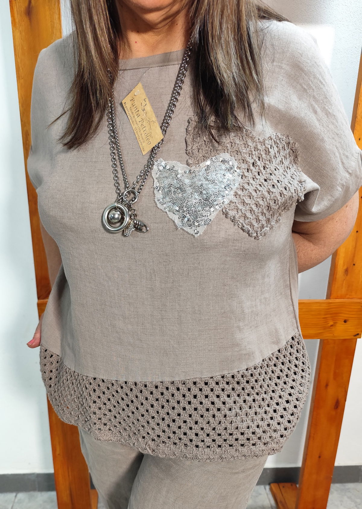 Remera de lino italiano, fresca y elegante, con detalle de corazón aplicado en lentejuelas y textura artesanal, que le da un toque especial sin perder sobriedad.