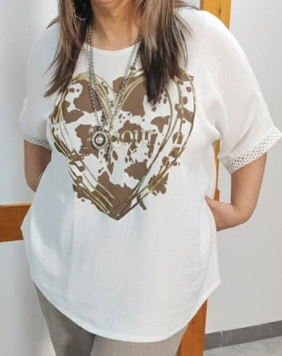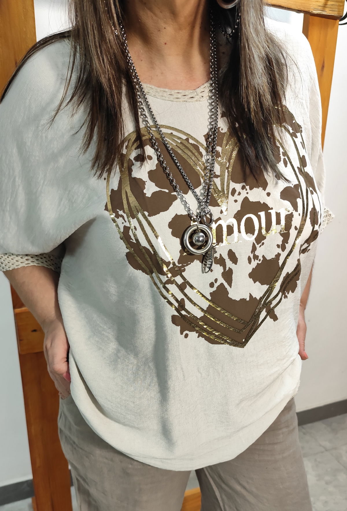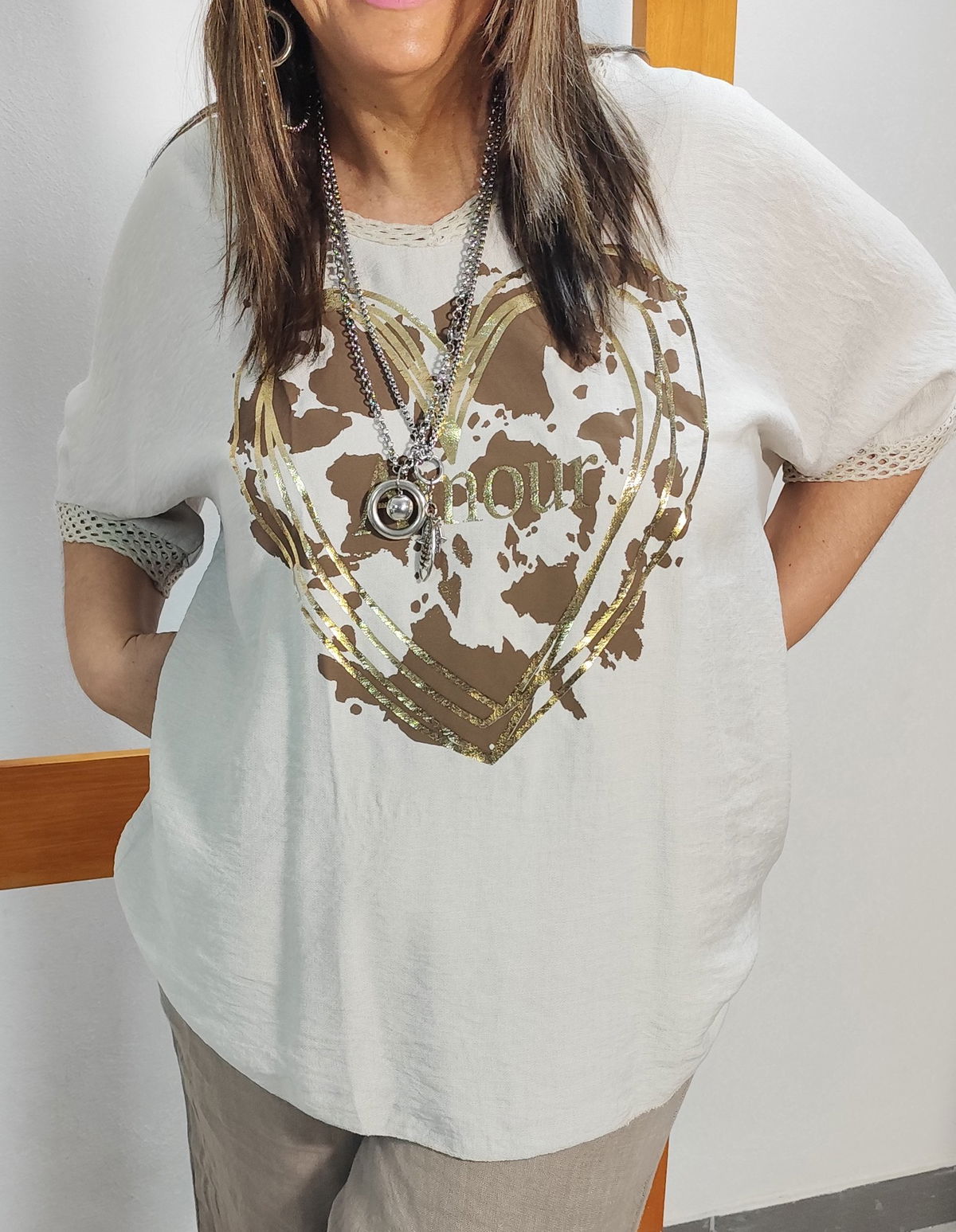 Remera de lino italiano, fresca y liviana, con estampa frontal de corazón animal print y detalles dorados que aportan luz y estilo. Tiene calce cómodo y caída suave, ideal para un look relajado pero con presencia.