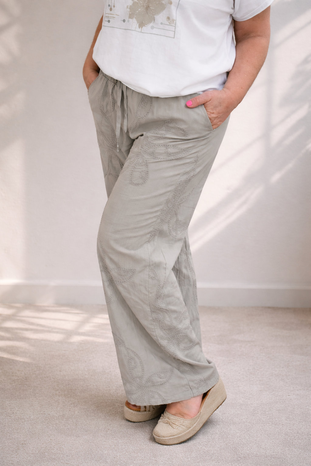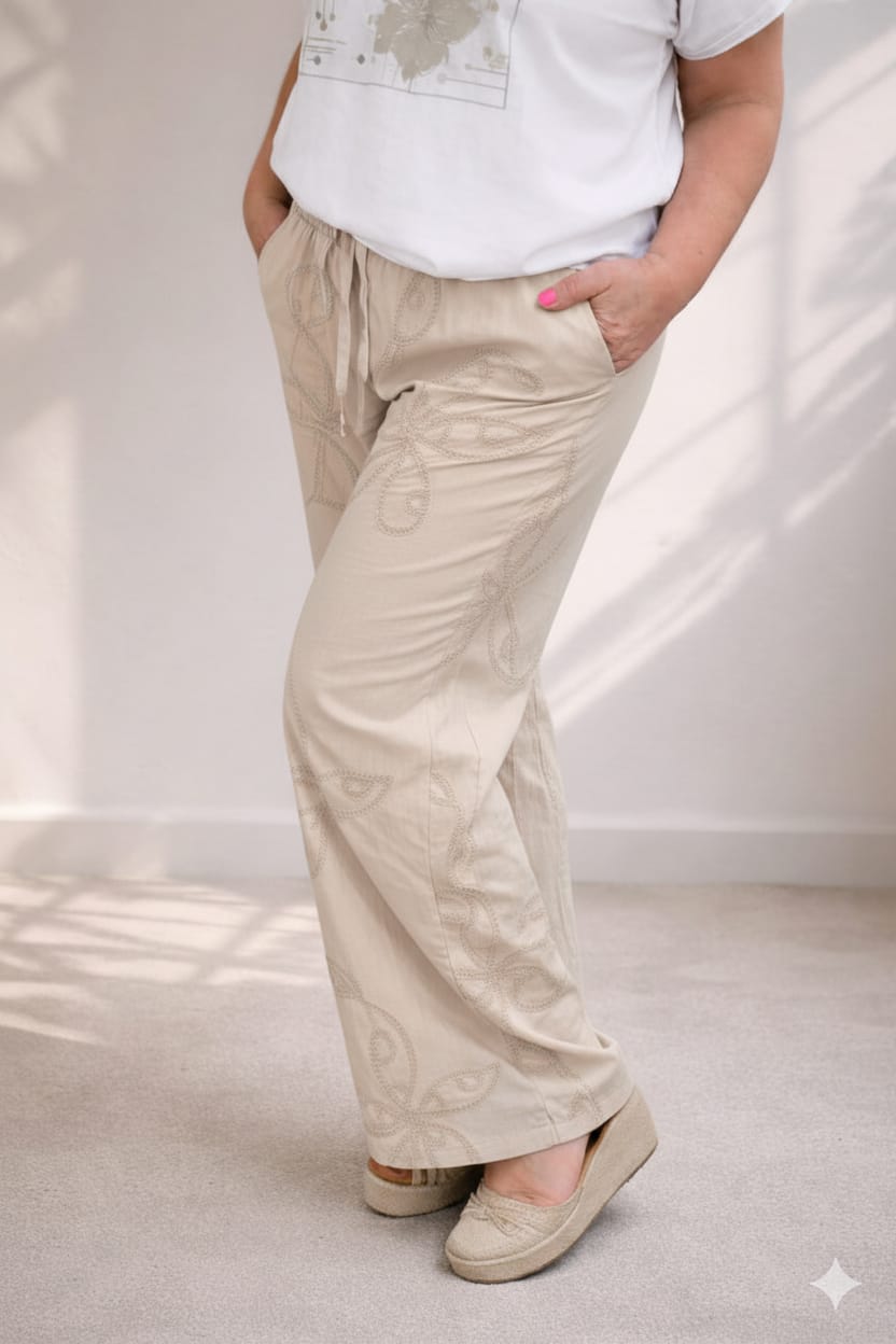 Palazo de lino italiano con cintura elastizada, caída amplia y diseño bordado que aporta textura y estilo. Fresco, cómodo y súper versátil, ideal para usar tanto de día como de noche.