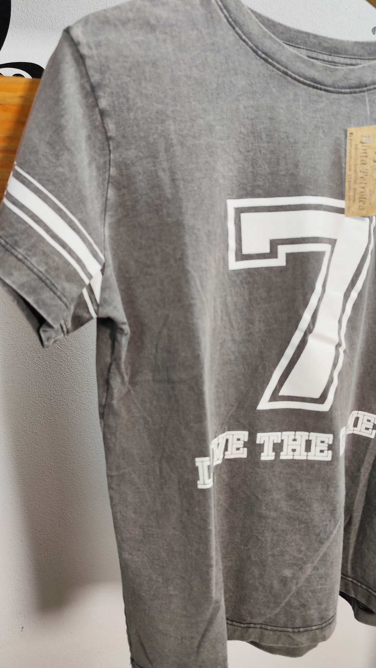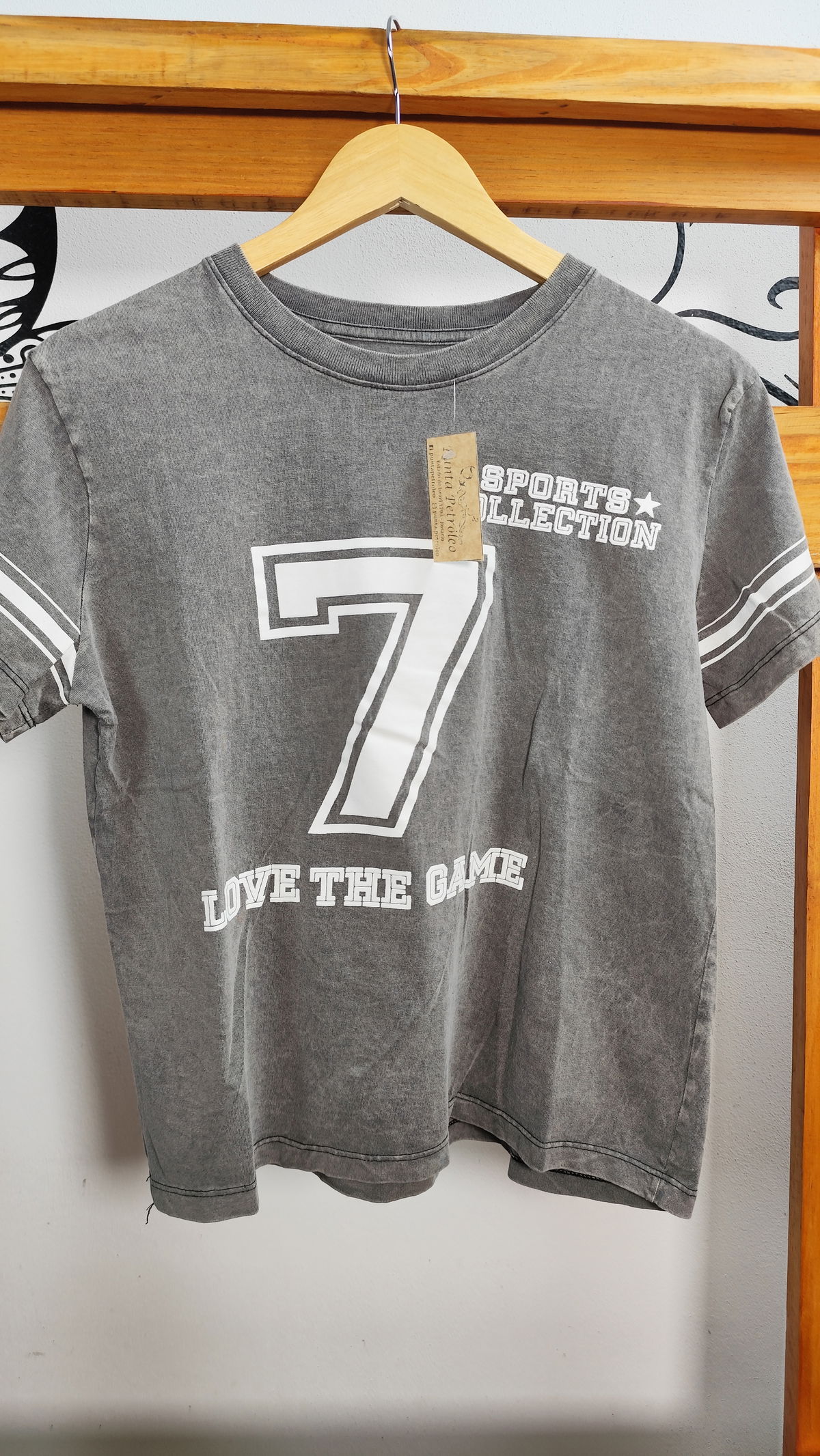 Remera gris batik con estampa deportiva frontal y detalles en mangas que aportan un estilo urbano con inspiración college.
