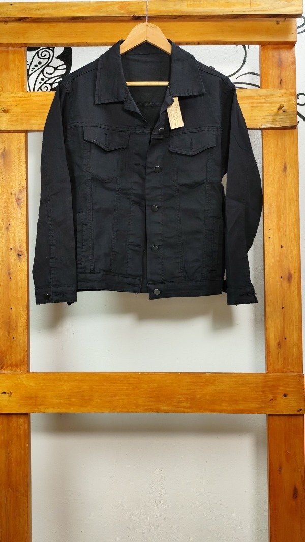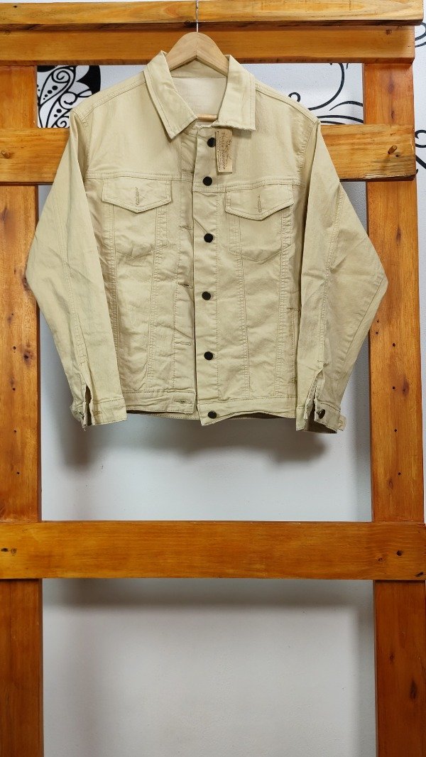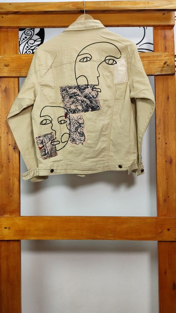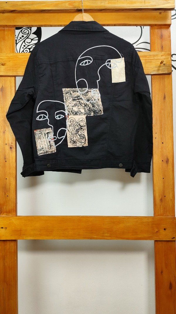 Campera de gabardina elastizada con apliques y diseño de rostros en la espalda