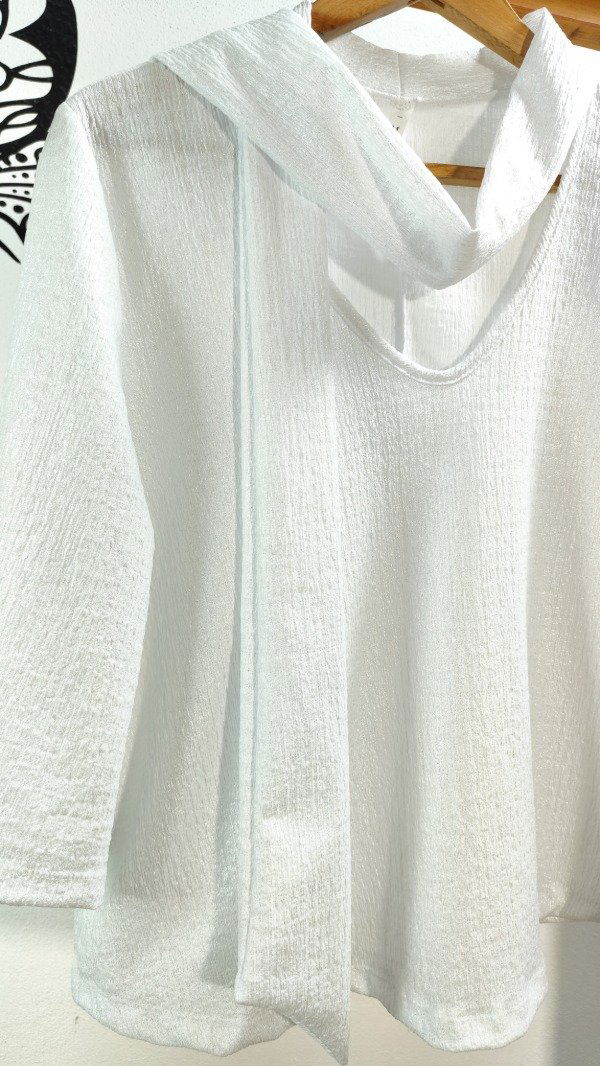 Blusa de crepé arrugado elastizado cuello lazo, mangas 3/4 anchas