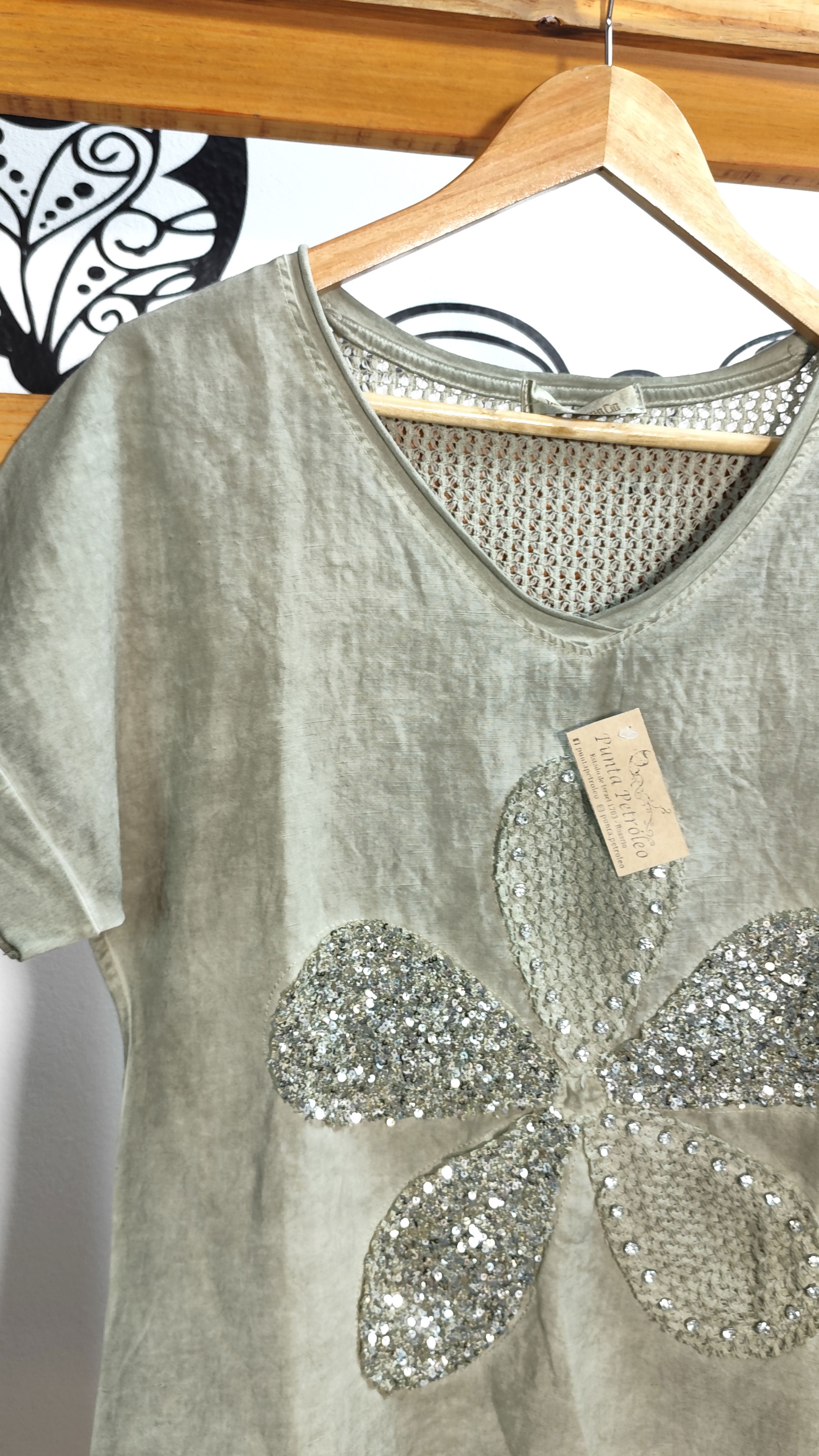 Remera italiana de lino con flor bordada en lentejuelas y crochet