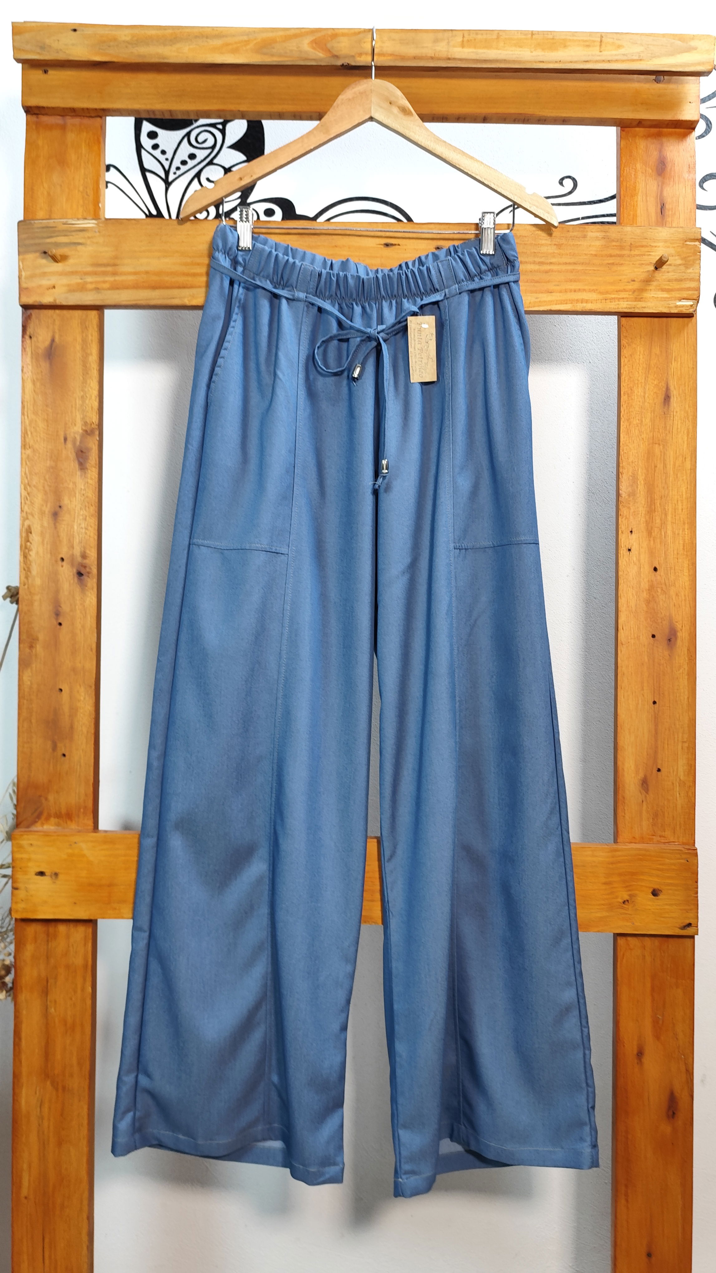 Palazo de jean con cintura elastizada. Con lazo y bolsillos externos