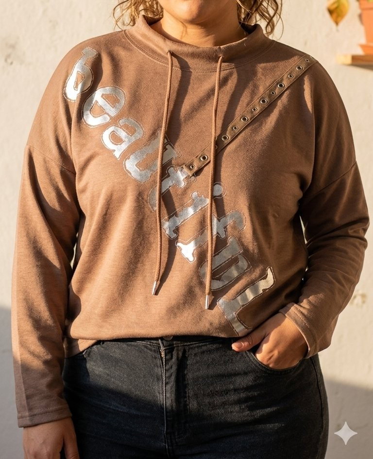 Corte Relaxed: Cuello semi-alto ajustable con cordones y hombros caídos para un calce cómodo y favorecedor.