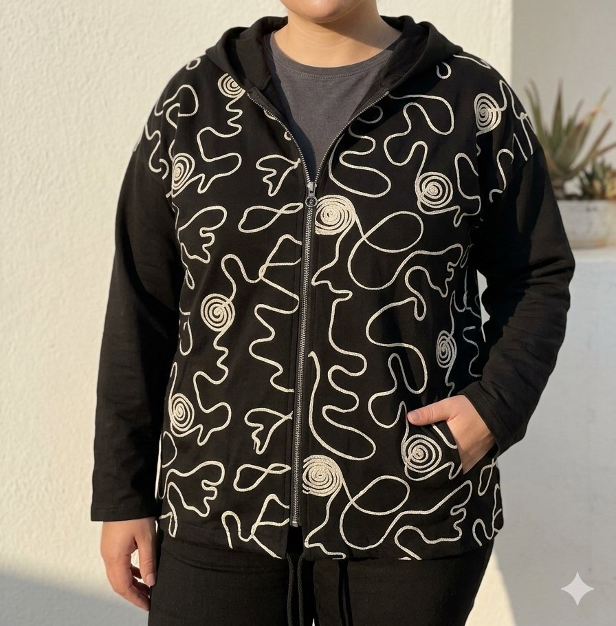 Dale un toque de diseño europeo a tu outfit diario con este campera italiana gamuzada. Confeccionado en un tejido suave de calidad premium, destaca por su exclusivo bordado de líneas abstractas y espirales que le dan una personalidad única y vanguardista.