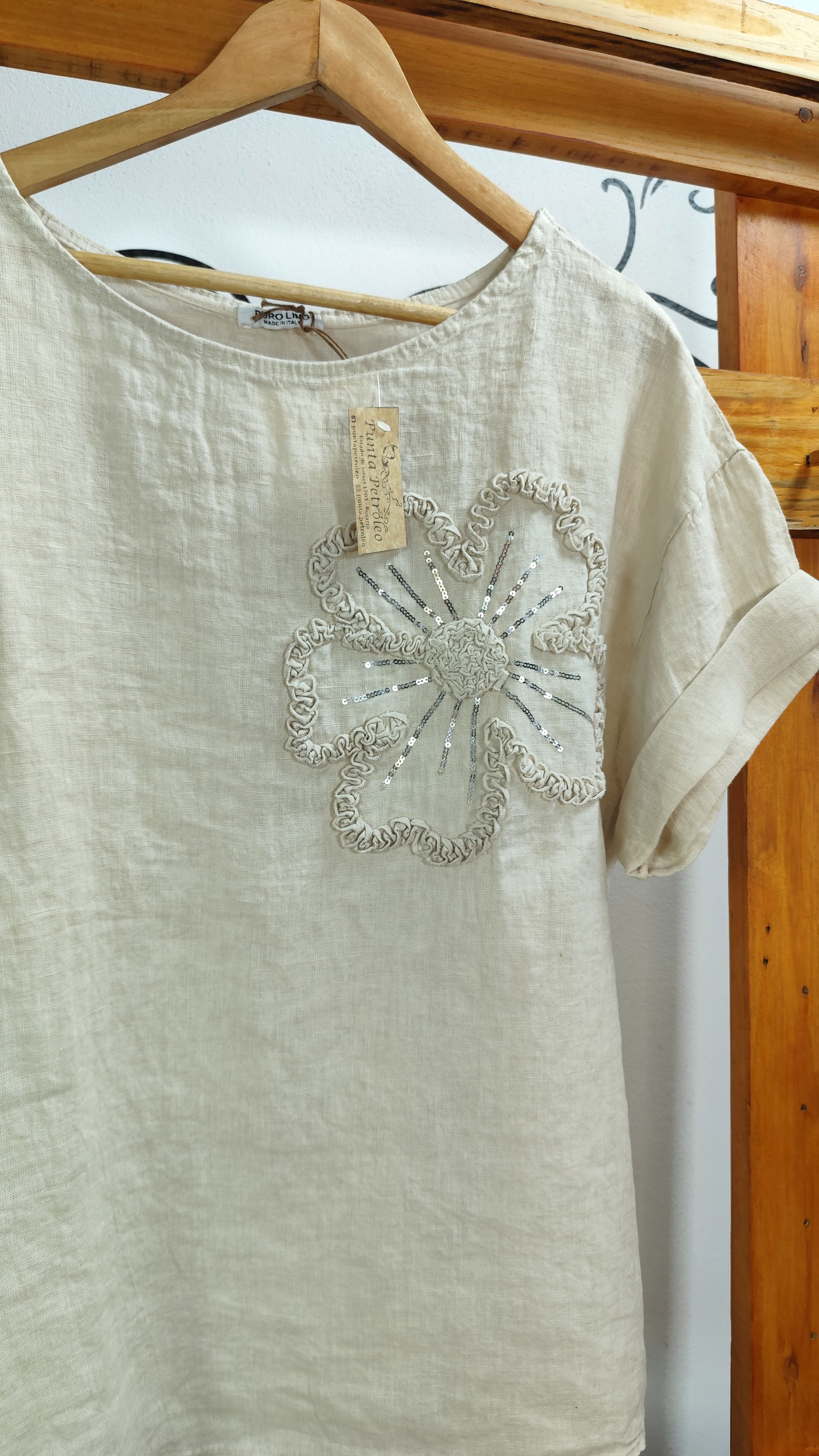 Remera Italiana 100% lino con flor bordada en lino y lentejuelas