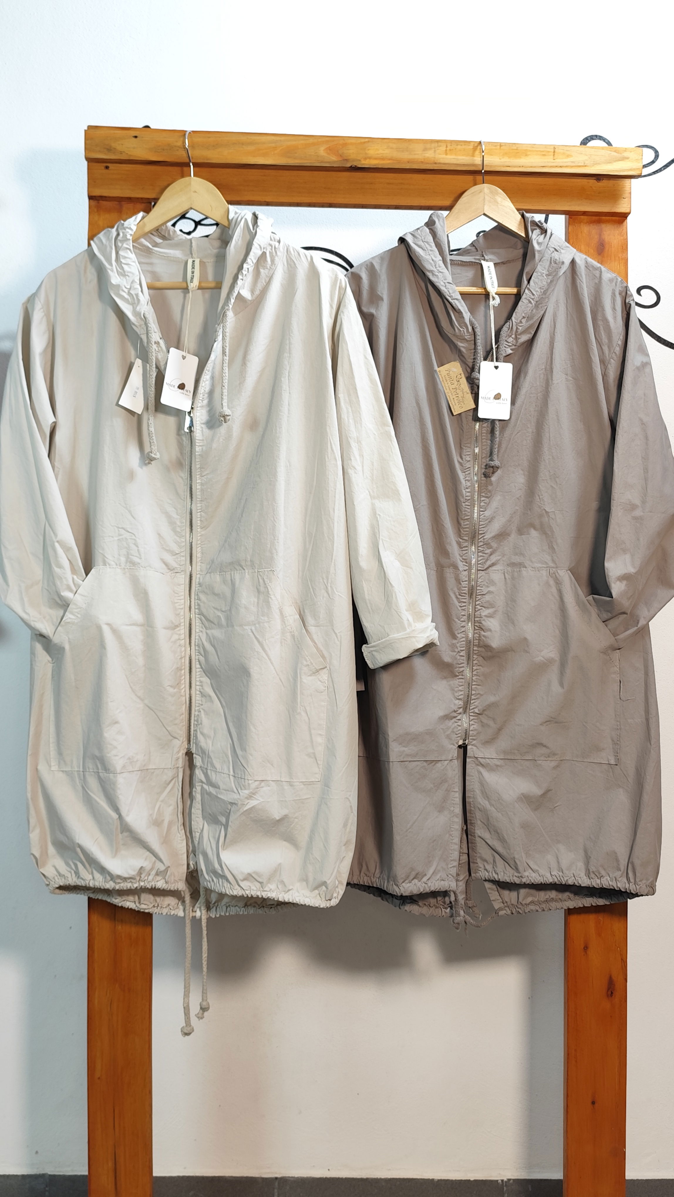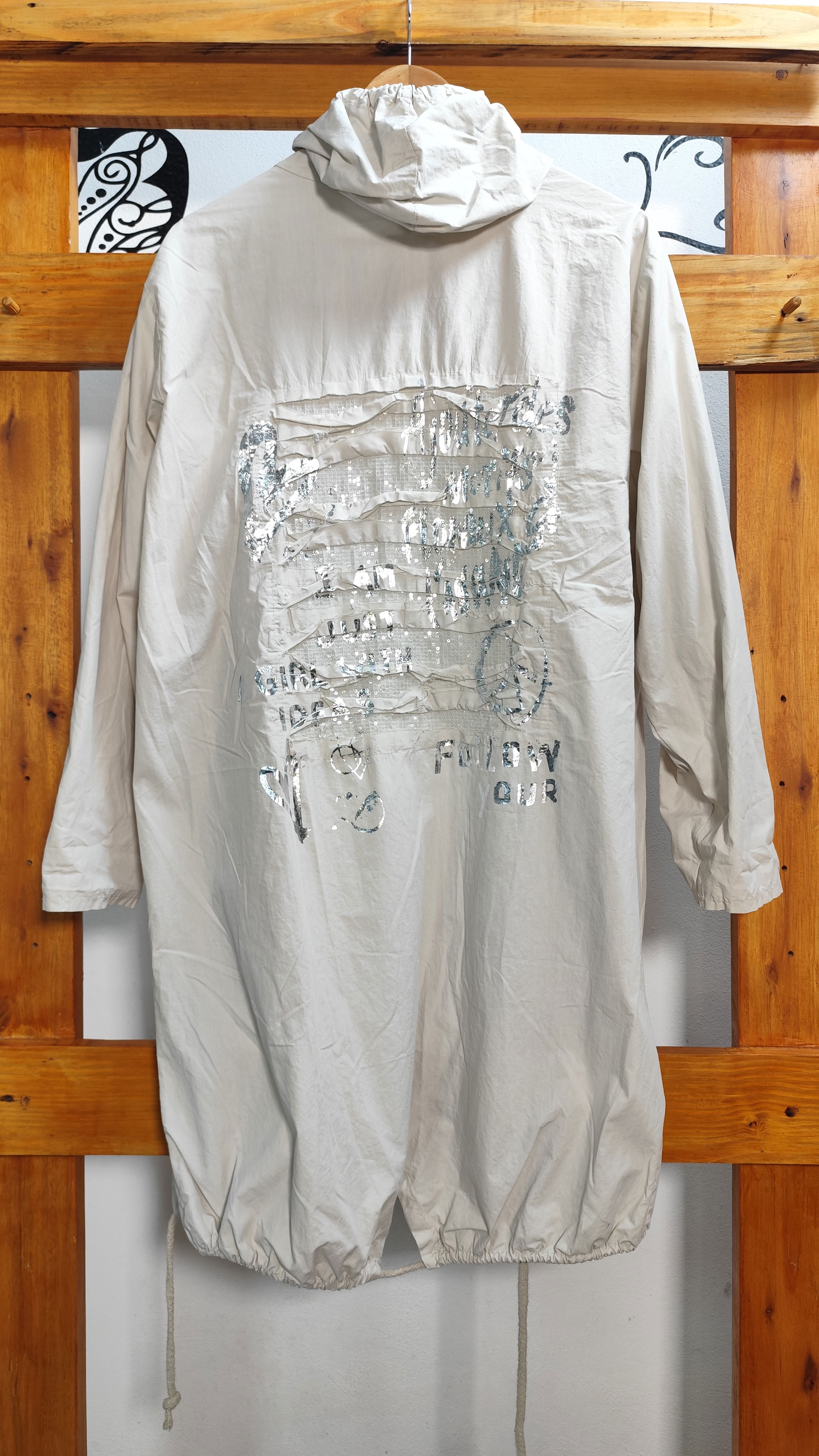 Campera Italiana Larga con capucha, con detalle de roturas y lentejuelas en la espalda. Tela súper liviana.