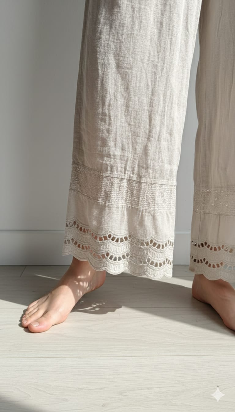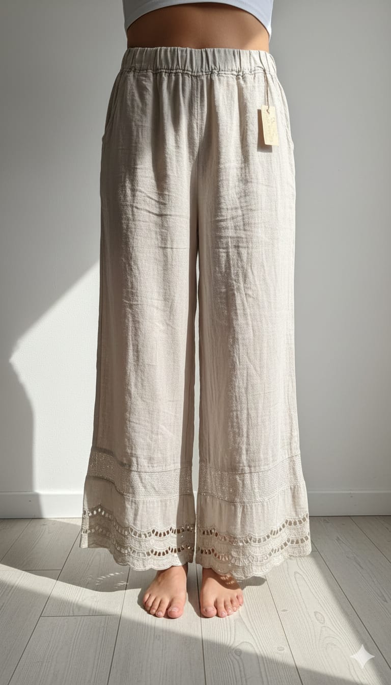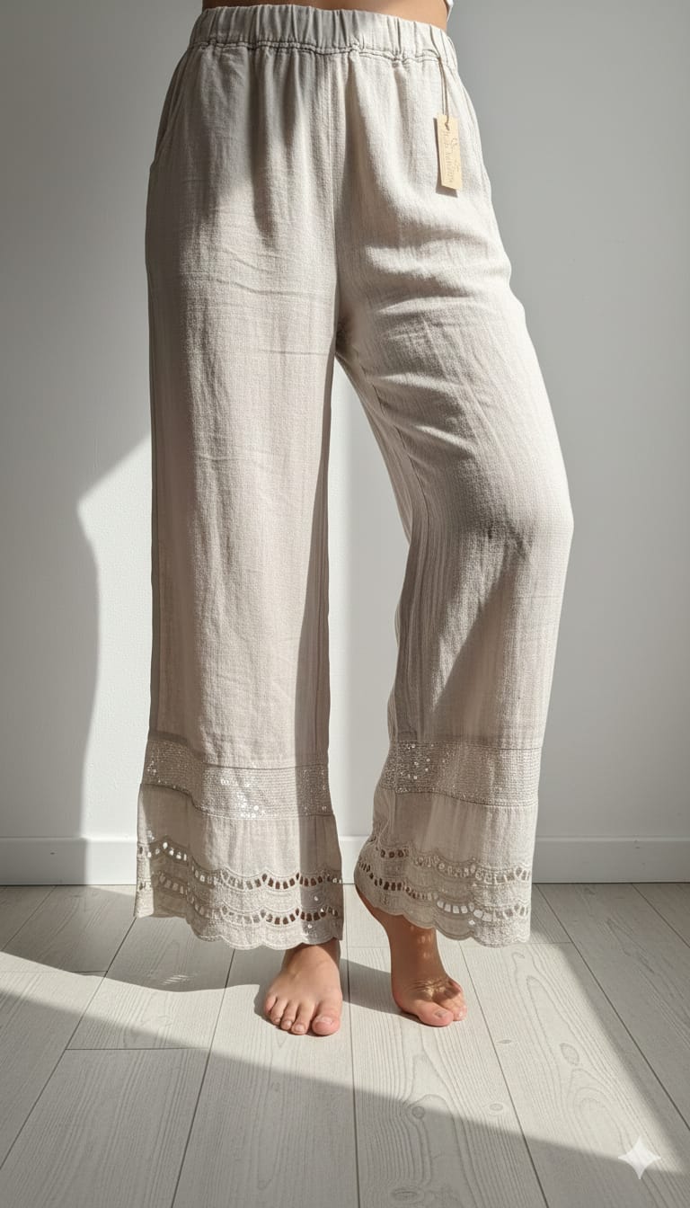 natural. Su cintura elastizada aporta confort, mientras que el detalle calado en el ruedo suma un toque artesanal y femenino. Una prenda fresca, versátil y fácil de combinar, ideal para acompañarte en los días de calor con estilo relajado.