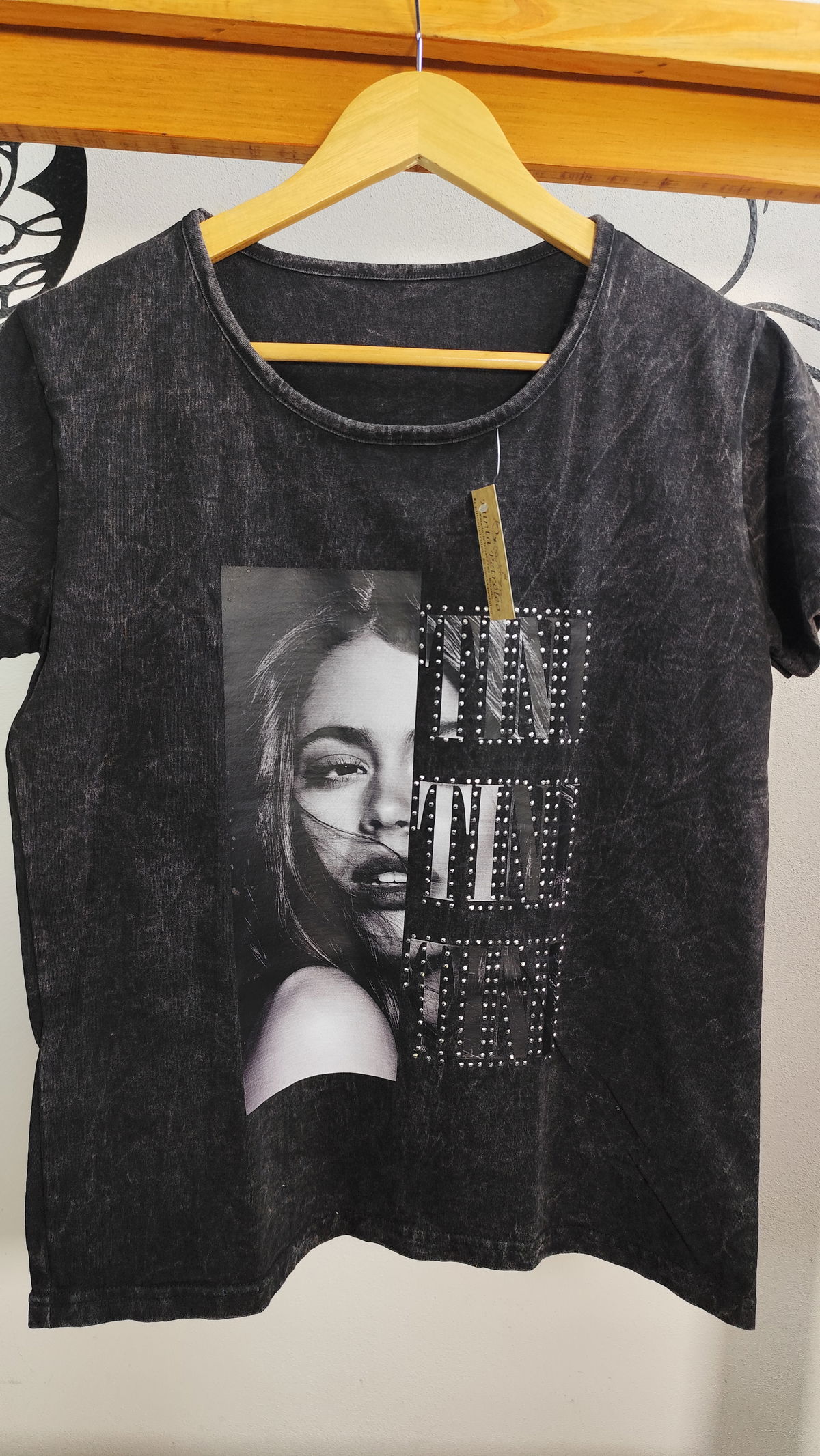 Remera gris batik con estampa frontal artística y tachas plateadas alrededor de las letras, que aportan brillo sutil y un toque moderno sin perder el estilo urbano.